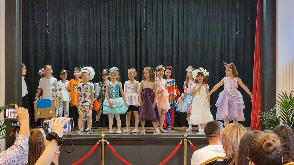 Fiecare copil trăiește experiența completă a teatrului: costume, lumini, public, aplauze și zâmbete.